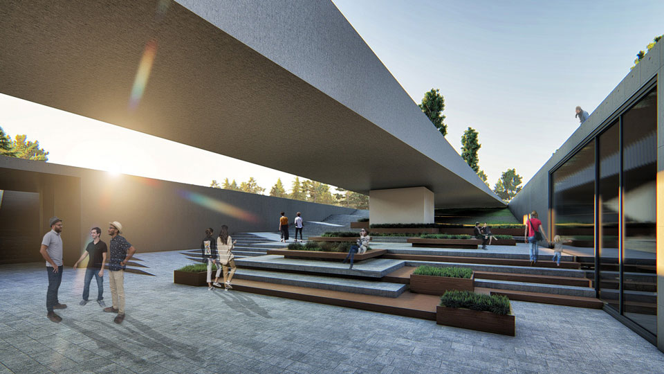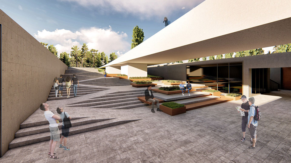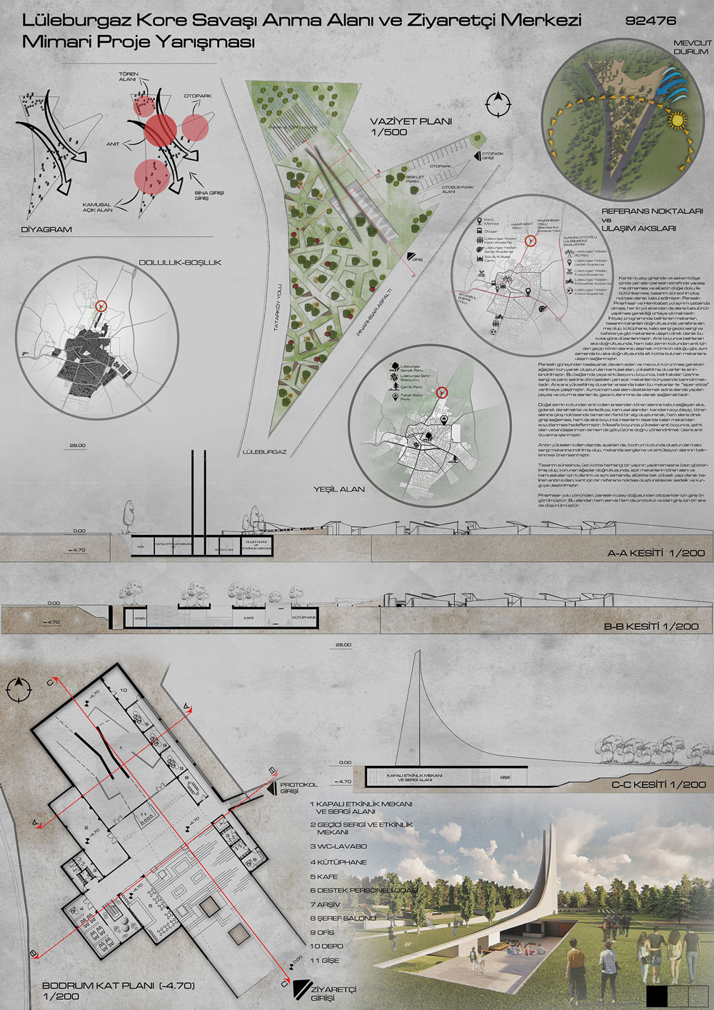 Bodrum Ticaret Odası Hizmet Binası için düşünülen arsanın fuar alanına cephe, ve dereye olabildiğince sırt vermesi tasarımı yönlendiren önemli etkenlerden biri oldu. Bina hem yol aksından hem de fuar alanından yön alacak şekilde, kabulü ve restaurant kısmı öne çıkarılarak fuar alanından da algılanması düşünüldü. Asıl cepheler fuar alanına yönlendirilmiş olup ileride oluşturulacak fuar alanı ile kopuk olmaması projenin çıkış noktalarından biri olarak tasarlandı. Ana yaya girişi yoldan direk bağlandı ve büyük derinlikli ve düşük rıhtlı olarak uygulanması ön görüldü. Böylece binanın ana girişine direk bir yönlenme sağlanmış oldu. Bu geniş basamaklar restaurant terası önünde, binanın bodrum katına inen merdiven kotu ile birleştirildi.